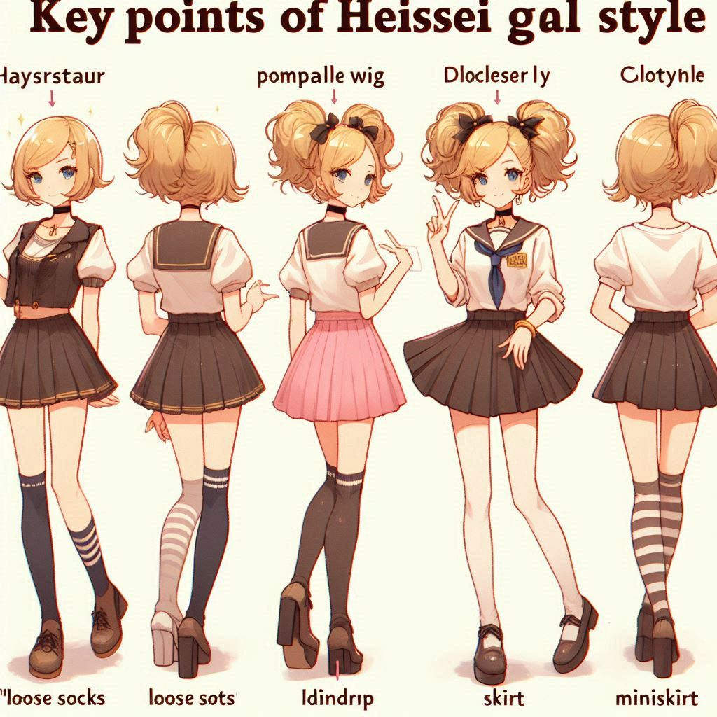 平成(2000年代前半風):ルーズソックス、プリクラ風アクセサリー、ガラケー